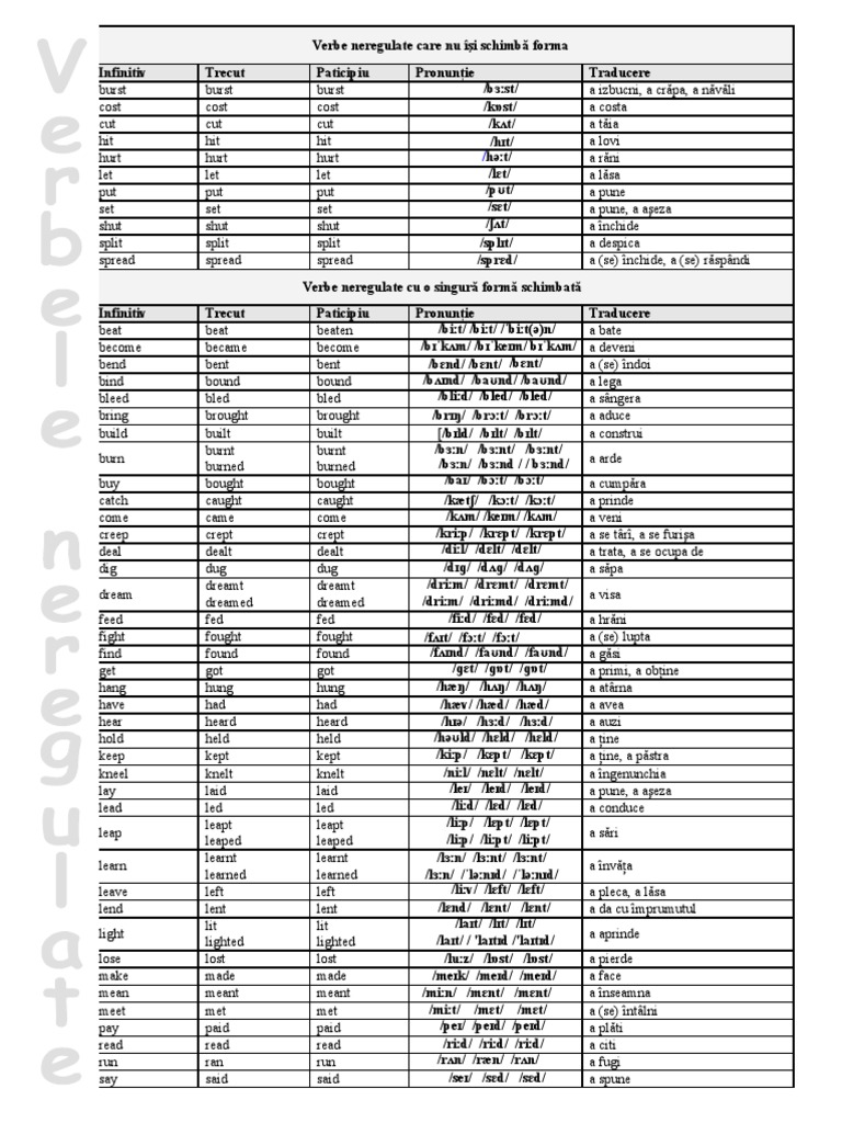 Verbul la infinitiv verbul la trecut verbul la participiu trecut traducere to abide sought (a cauta) to sell sold sold (a vinde) to send sent sent (a trimite) to set set set (a pune) to sew sewed sewn / sewed (a coase) to shake shook. Yandex.translate works with words, texts, and webpages. Pentru a răspunde la o întrebare trebuie să ai cont pe tpu.ro.