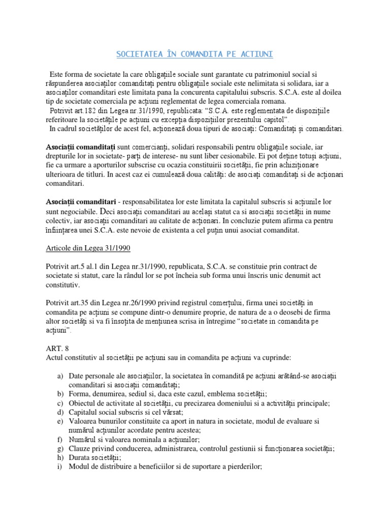 vizitati articolul complet aici : www.bvb.ro Authors may reuse all or portions of the above paper in other works, excepting the publication of the paper in the same form. Legea societatilor comerciale actualizata 2018. Legea 31/1990, actualizata 2011, (r2), privind societatile.